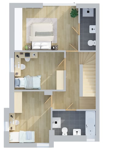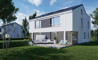 Powyższe wizualizacje rzutów lokali przedstawiają lokal lewy (lokal nr 1 wg projektu AB). Lokal prawy ma takie same wymiary lecz jest symetrią względem osi ściany międzylokalowej.